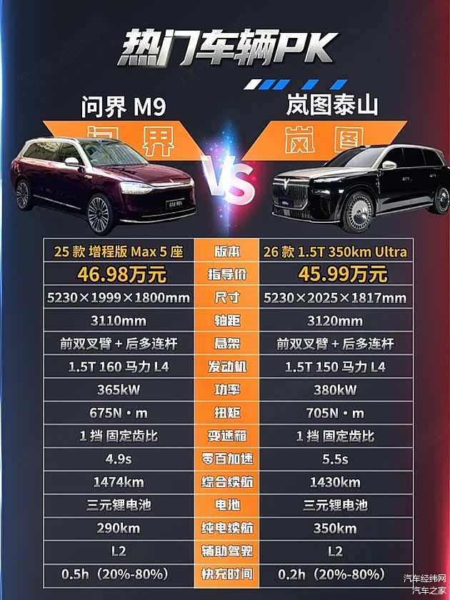问界M9 2025款增程Max版52kWh 5座版售价为46.98万元,而岚图泰山2026款Ultra售价为45.99万元,两款车均为大型SUV,售价比较接近,问界M9已经具备了比较强的品牌影响力,那么岚图泰山能否挑战呢?