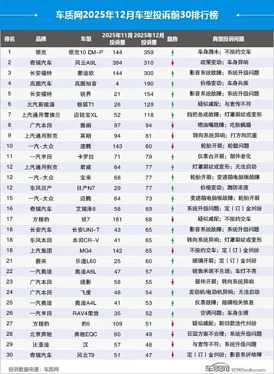 2026年1月份,车质网公布了2025年12月车质网投诉榜单,根据榜单显示,极狐汽车旗下的 极狐T1赫然在列,以129起投诉量位居榜单第8名,较11月投诉量暴涨近4倍,成为当月投诉量增幅最显著的车型之一。这款自2025年9月上市以来,凭借“大容量、真续航、极安全”等宣传标签,精准瞄准家庭用户的纯电车型,如今却因严重的品质问题与不负责任的处理态度,陷入信任危机。