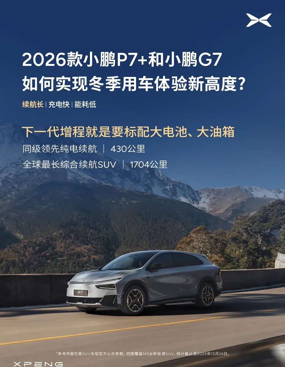 何小鹏参与小鹏G7超级增程与2026款小鹏P7+冬测。此次测试在室外平均- 20℃的极端环境下开展,测试条件严苛,全程不跨温区、保持0高度差,且车辆空调稳定在21℃。实测数据显示,小鹏 G7超级增程综合续航达1108.3公里;2026款小鹏P7+借助导航电池预热功能,热车状态下12 分钟即可完成10%—80%补能。这些极寒环境下的核心性能数据,为北方用户冬季用车提供了关键参考,两款车型后续上市动态都值得关注!