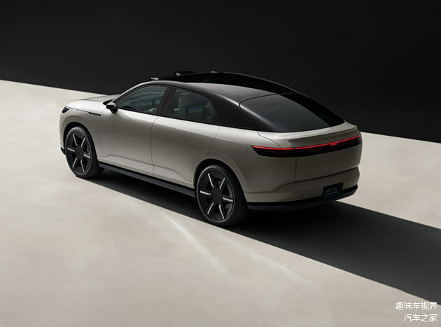 车身侧面,双色车身搭配大溜背造型使其跨界风格满满,车身线条兼顾轿跑的流畅与SUV的灵动,相较于AFEELA 1轿车版本,新车车身高度显著提升,进一步强化了跨界属性。细节处,新车采用隐藏式电动门把手优化风阻,轮眉处辅以宽体套件勾勒硬朗姿态,五辐式运动轮毂搭配低滚阻轮胎,兼顾视觉张力与实用性。车尾部分,溜背线条自然延伸至小尺寸扰流板,贯穿式尾灯与前脸屏幕形成呼应,双边隐藏式排气布局保持整体简约风格,车身尺寸参考家族车型,预计轴距接近3000mm,为车内空间提供保障。
