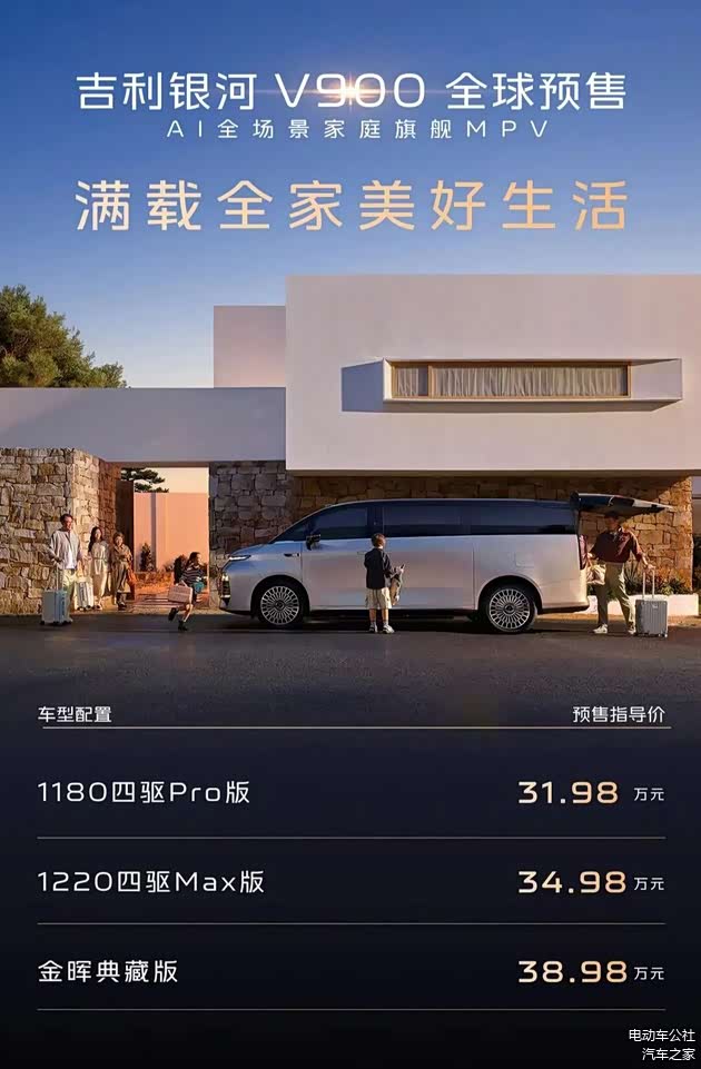 吉利 银河V900,一款巨大体型的增程MPV,预售价31.98-38.98万元。