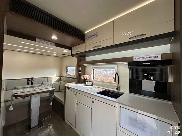生活区的设计十分巧妙,后U型卡座与升降吊床的组合为生活区提供了多种使用场景。U型卡座可满足多人围坐休息、用餐或娱乐,气动升降桌腿与四向滑移桌板的搭配,让餐桌使用更加便捷。升降吊床则在需要时提供额外的睡眠区域,增加了车内的睡眠容量。此外,车内还配备了车载HiFi喇叭与无源低音炮的组合,为车内娱乐提供了高品质的音效体验,让旅行者在旅途中也能享受音乐的陪伴。