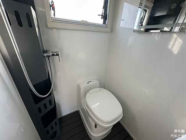 卫生间采用嵌入式设计,防滑塑木地板防潮不发霉,能提供干燥的使用环境。门槛处设计有不锈钢折边包覆,带斜坡设计防止溢水到门外。配置有赛特福德便携式抽拉马桶(可选装松下智能马桶盖)、多功能换气扇、双地漏不锈钢底托、淋浴花洒等,满足日常洗漱淋浴需求。多功能换气扇集成了PTC电暖风、照明、换气、风扇等功能,确保卫生间通风良好、温度适宜。储物系统方面,多组储物格+壁龛的设计让洗漱用品分类存放,整洁有序。