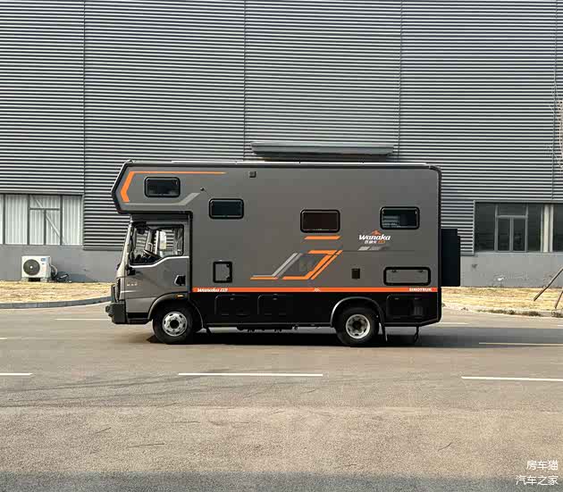 瓦纳卡豪沃悍将Pro房车外观大气而不失精致,车身尺寸为5995×2450×3390mm,严格遵循蓝牌C照驾驶标准,兼顾了通过性与内部空间的宽敞性。金属灰色的车头时尚大气,与喷涂了黑色防爆漆的裙边相得益彰,展现出稳重又不失时尚的独特气质。车厢同样采用金属灰色,与车头呼应,黑/橙色搭配的裙边和腰线则为整车增添了一抹动感与活力。高耐候FPR玻璃钢额头造型件不仅提升了抗冲击性,还为额头床区域提供了额外的安全保障。一体式平顶设计理念从根本上解决了漏水隐患,同时也能加装更多的太阳能板,为车内能源供应提供支持。