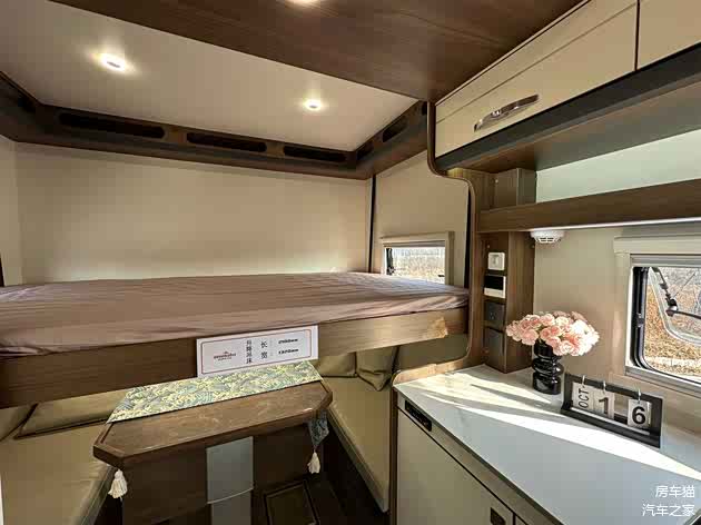 进入车内,米白与浅木的配色搭配暖光,瞬间营造出温馨舒适的家居氛围。车内空间宽敞明亮,布局经过精心设计,合理利用每一寸空间,提升了空间利用率。生活区采用经典的后横床对卡座布局,整体内饰工艺精湛,细节之处尽显品质。驾驶室与生活区采用贯通设计,通舱口配备瓦纳卡专利的隐藏式折叠踏步,上下床更加便捷。