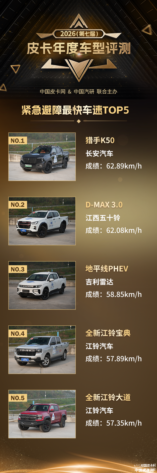 上面公布的成绩中,长安猎手K50通过紧急避障的车速最快,达到了62.89km/h,也就是说明在遇到突发障碍时,这台车有更稳定的车身姿态快速通过,车辆可控性更强。预计是由于这台车的电池部分位于车辆底部,重心较低,并且整车在悬架稳定性控制方面有着非常好的调校,得以有此优秀成绩。另一台新能源皮卡雷达地平线PHEV凭借着承载式车身的优势位列第三。而 江西五十铃D-MAX 3.0仍然有较好的调校水准,位列第二。