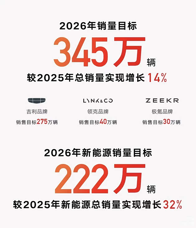 随着2025年收官,多家车企相继公布了年度销量,并根据销量数据制定了2026年的销量目标。吉利汽车2025年超额完成300万辆的销量目标,实际销量超过302万辆。2026年,吉利汽车计划挑战345万辆年销量目标,同比增长达到14%。东风集团将2026年的销量目标锁定为325万辆,相比2025年300万辆的销量目标增加了25万辆。目前东风集团还未公布2025年销量,但前11个月销量为220.4万辆,全年销量可能在250万辆左右。
