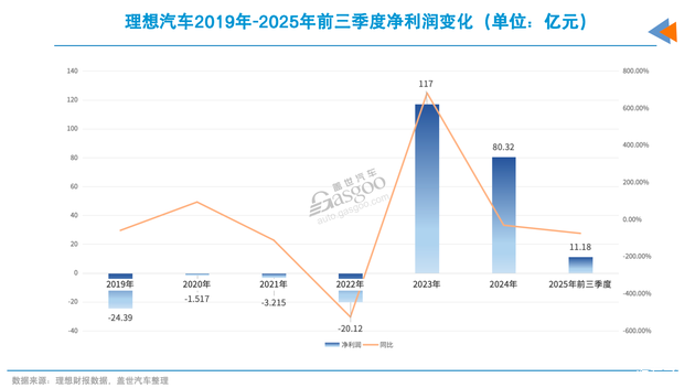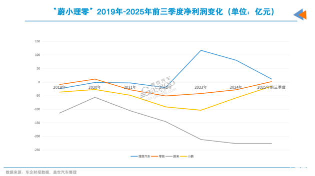 几家车企中,理想尽管2025年表现不如预期,全年交付量仅40余万辆,但是其依然能保持正盈利。去年前三季度,理想归母净利润为11.2亿元。2023年-2024年期间,年净利润分别为117亿元和80.3亿元。