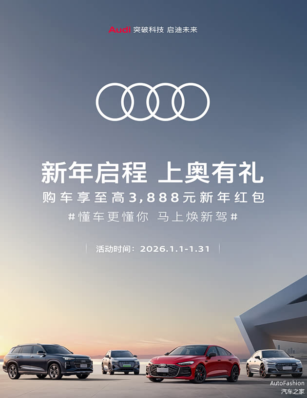 全新上汽奥迪A5L Sportback旗舰车型(200kW)已全面开启交付。值此新年到来之际,上汽集团正式启动“懂车更懂你,马上焕新驾——2026上汽新春欢乐购”。上汽奥迪同步推出新年购车礼遇:即日起至1月31日,购买全新上汽奥迪A5L Sportback、上汽奥迪A7L、上汽奥迪Q6或上汽奥迪Q5 e-tron任意车型,可享至高3,888元新年红包。