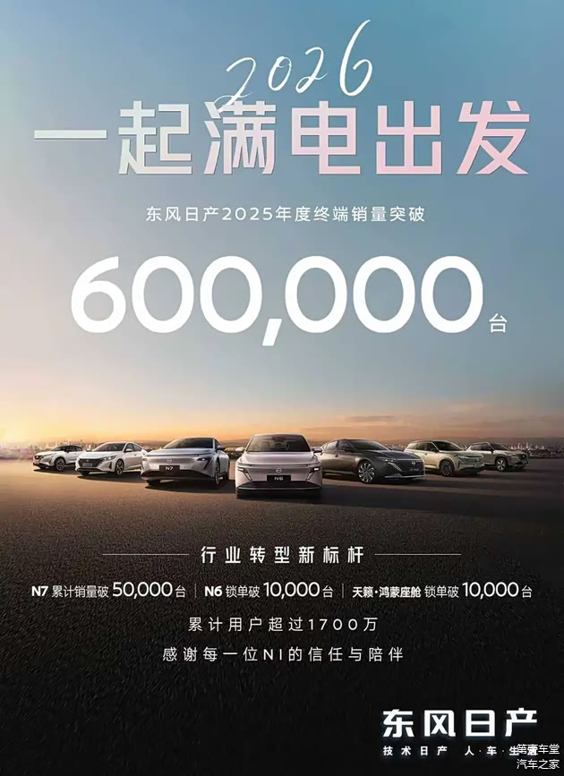 东风日产2025年全年销量60万辆,累计用户超1700万,纯电家轿N7全年销量破5万辆,新能源转型初见成效。核心燃油车轩逸凭借终端3-4万元的优惠,销量也是稳居燃油车销量榜前列,为东风日产打下了坚实的基本盘。同时,东风日产其它燃油车,像逍客、天籁等车型,随着新品的上市,也在逐步恢复元气。