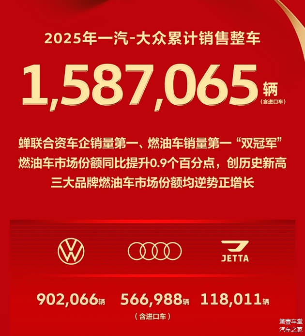 一汽-大众全年整车销量1587065辆(含进口车),蝉联合资车企销量第一、燃油车销量第一。其中,大众品牌902066辆,奥迪品牌566988辆(含进口车),捷达品牌118011辆,让一汽-大众品牌燃油车市场份额逆势上涨0.9个百分点,奥迪品牌燃油车市场份额更是在时隔六年后重回豪华车市场第一。