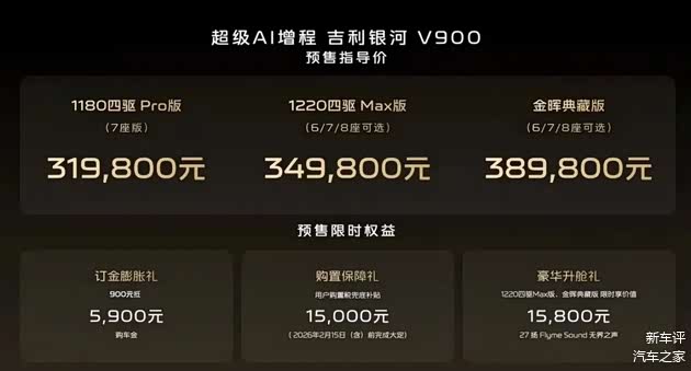 电池容量缩小、加入增程器,价格毫无疑问是降低的,吉利 银河V900的预售指导价为31.98-38.98万元,还有5000元的订金膨胀优惠,等于价格门槛不到31.5万元,这个价格符合你们的心理预期吗?反正我个人觉得合理,但还有下探的空间。