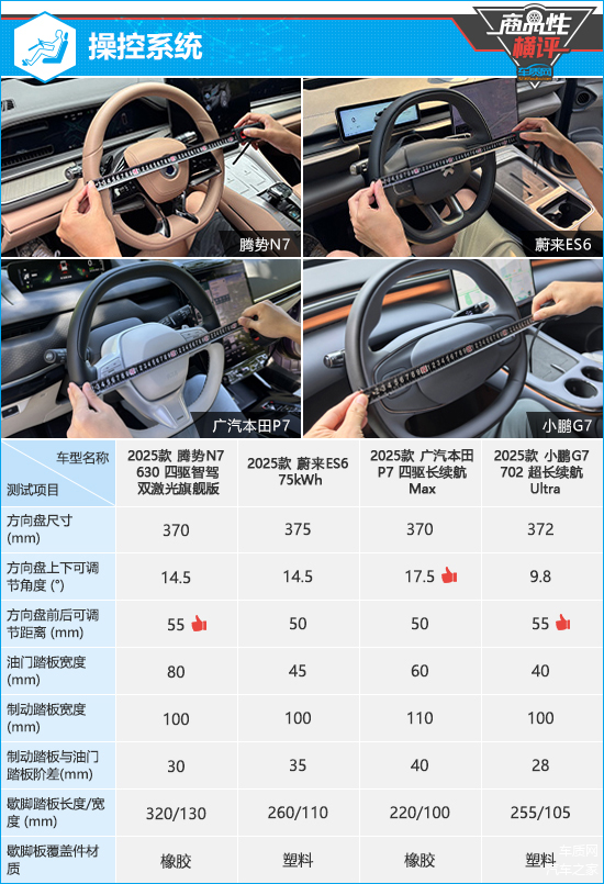 在操控系统测试对比环节,除蔚来ES6的方向盘尺寸稍大外,其余三款车型的方向盘直径差距不大,可兼顾操控稳定性和灵活性。方向盘调节方面,广汽本田P7在上下可调节角度测试中处于领先地位,腾势N7和小鹏G7则在前后可调节距离测试中表现出色,在四款车型中排名并列第一。