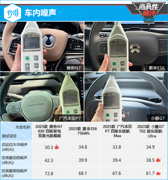 经实测,在启动状态下,腾势N7对于车外噪声隔绝效果相对不错,实测噪声值为30.3dB,接近测试仪器的最低值。蔚来ES6和小鹏G7车内实测噪声值相对较高,但也未超过同级别车型平均水平。