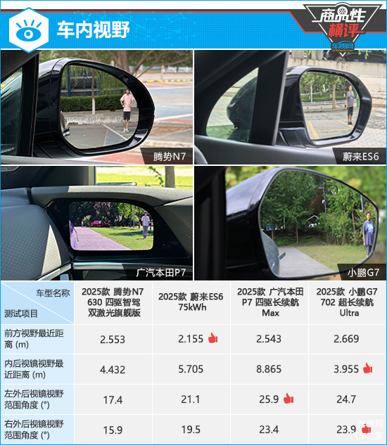 在外后视镜视野范围角度测试中,广汽本田P7两侧外后视镜测试成绩分别达到同级别中游和上游水平。小鹏G7右侧外后视镜测试成绩同样达到同级别上游水平,并以微弱优势取胜。相比之下,腾势N7两侧外后视镜测试成绩在四款车型中垫底,与同级别车型测试均值存在较大差距。