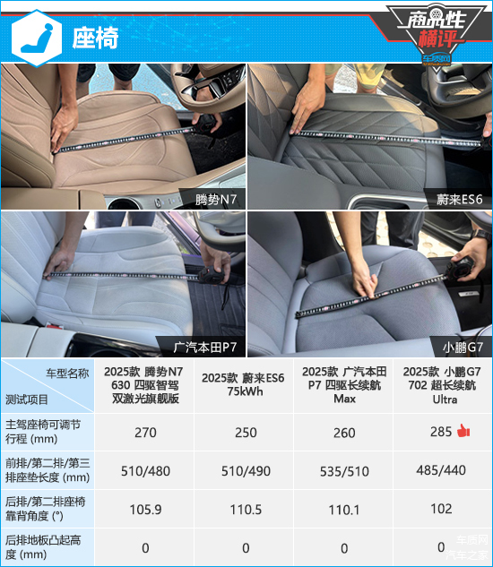 在座椅测试对比环节,根据已测得的数据来看,腾势N7、广汽本田P7和小鹏G7的主驾座椅可调节行程均达到同级别车型上游水平,其中小鹏G7的测试数值相对较大,可以适配更多驾驶者的驾驶习惯。