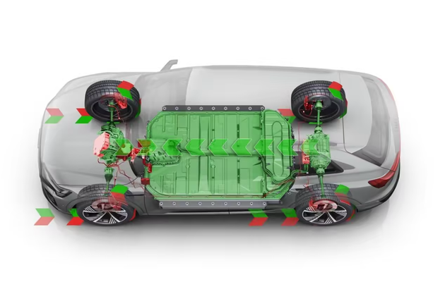 在新能源车上,当我们踩下电门的时候,电池给电机供电,电机输出扭矩推动车轮转动,从而完成行驶。而当我们松开电门后,车辆会随之减速,整个动能链条就会反向运作,车轮在惯性的作用下继续转动,但却变成了“拖着”电机反转,于是电机就变成了一个“发电机”。