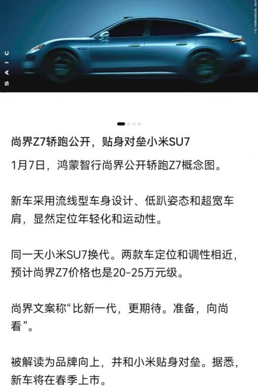兄弟们,真没想到啊,2026年这才开年第一周,汽车圈里的火药味就已经这么浓郁了。1月7日,小米雷军刚宣布完新一代SU7将于2026年4月上市,并开启小订。另一边,鸿蒙智行旗下的尚界品牌便发布了旗下第二款车型 尚界Z7的预告图。你说这是不是好巧不巧?