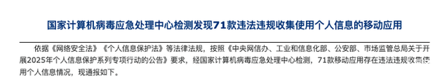 与此同时,根据最新消息:1月6日,有71款APP被通报存在违法违规收集使用个人信息情况,其中包括东风风神、乐道、深蓝3家汽车企业APP。