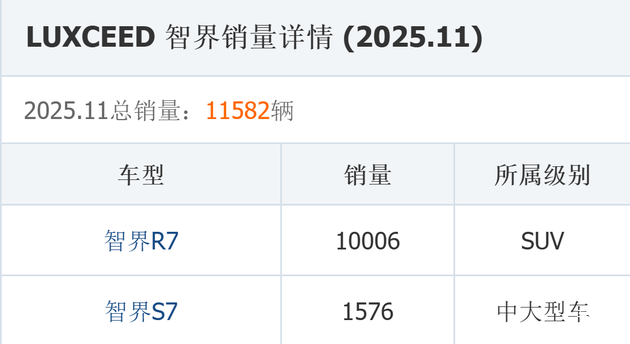 销量数据直观地印证了智界R7的“定海神针”作用,2025年11月智界全系累计交付11582 辆,其中智界R7单月销量高达10006辆,而智界S7仅为1576辆。可见智界R7已经成为品牌销量破万的绝对功臣,这一现象级表现,很大程度上得益于智界R7在8月份完成的改款。