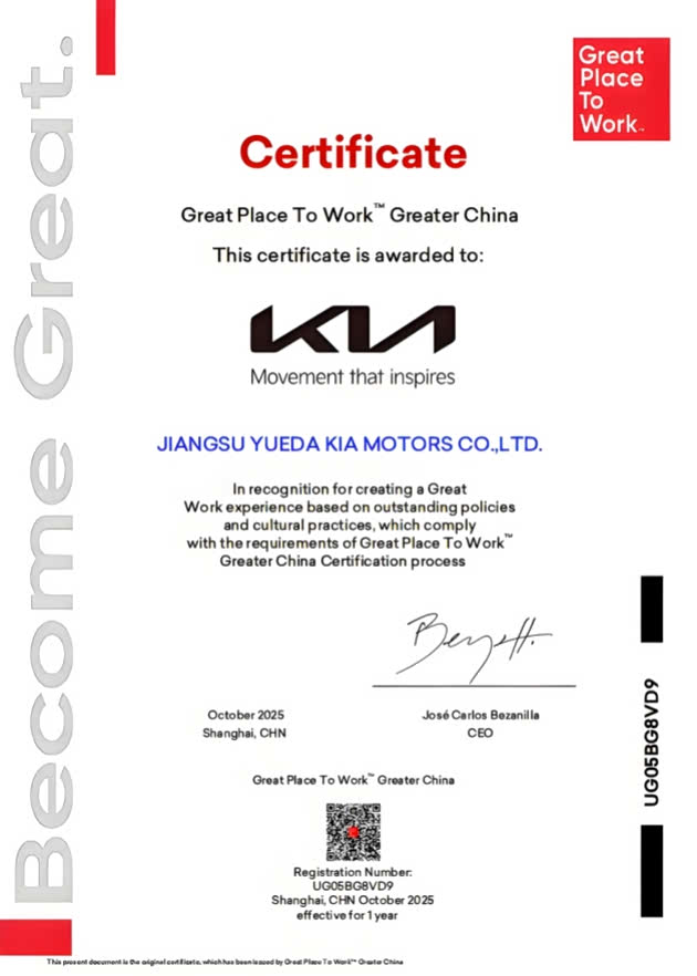 值得关注的是,在行业极度内卷的背景下,悦达起亚积极推进组织文化变革,构建了企业与员工和谐共生、双向赋能的职场生态,深入践行“以人为本”的长期主义发展理念。凭借在职场文化、人才梯队、员工关怀等领域的卓越实践,悦达起亚以93%的员工信任指数,高分荣获全球权威职场文化评估机构——Great Place To Work® (卓越职场研究所)颁发的“卓越职场”认证,成为2025年中国汽车行业唯一获得此项殊荣的汽车企业。