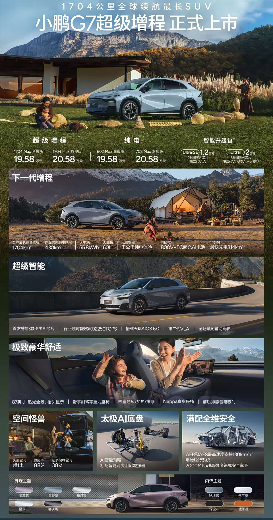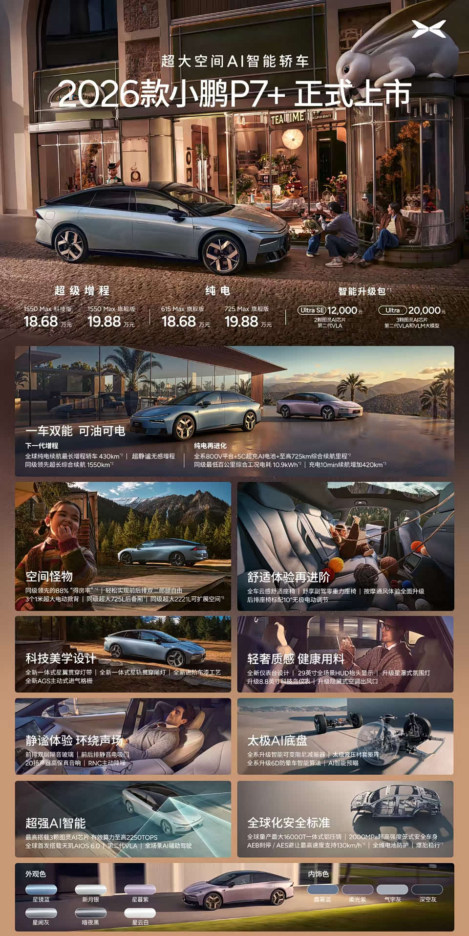 车盟快讯:1月8日,小鹏汽车举办2026开年首场发布会。在小鹏X9增程版率先定义标杆后,今日小鹏正式推出G7与P7+超级增程版。新车搭载“鲲鹏动力”,凭借430km纯电续航及1704km综合续航,彻底终结里程焦虑。