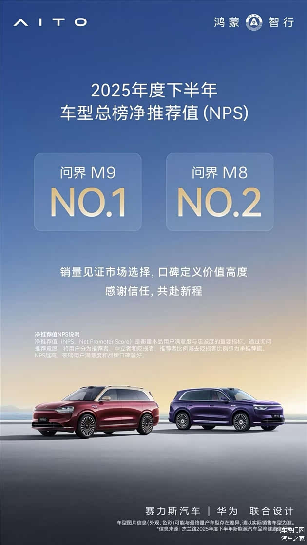 近日,专业市场研究机构杰兰路正式发布《2025年度下半年新能源汽车品牌健康度研究》报告。在该报告备受关注的车型净推荐值(NPS)总榜中,问界品牌旗下“双旗舰”表现亮眼,全景智慧旗舰SUV问界M9稳居榜首,而上市仅8个月的家庭智慧旗舰SUV问界M8首次参评便强势夺得第二。这一成绩不仅直观反映了问界M8在目标用户群体中的强劲推荐意愿,也进一步巩固了问界在高端新能源细分市场的口碑影响力。
