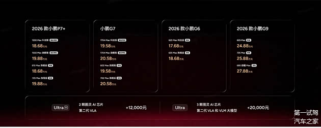 1月8日,在2026小鹏全球新品发布会上,小鹏汽车正式发布2026 款小鹏 P7+、小鹏 G7 超级增程、2026 款小鹏 G6、2026 款小鹏 G9。其中2026款小鹏P7+ 全球36国同步发布,新车有超级增程和纯电两种能源形式,超级增程有1550 Max 科技版和1550 Max 旗舰版,官方指导售价为18.68万元和19.88万元;纯电有615 Max旗舰版和725 Max 旗舰版,官方指导售价为18.68万元和19.88万元。2026款小鹏G7推出四个版本,超级增程1704 Max 科技版和1704 Max 旗舰版,官方指导售价为19.58万元和20.58万元;纯电602 Max 旗舰版和702 Max 旗舰版,官方指导售价为19.58万元和20.58万元。2026 款小鹏 G6推出纯电625 Max 科技版和625 Max 旗舰版,官方指导售价为17.68万元和18.68万元。2026 款小鹏 G9推出纯电625Max、725 Max和680 四驱Max版,官方指导售价为24.88万元、25.88万元和27.88万元。
