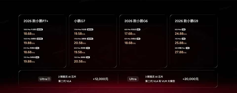 1月8日,在2026小鹏全球新品发布会上,小鹏汽车正式发布2026 款小鹏 P7+、小鹏 G7 超级增程、2026 款小鹏 G6、2026 款小鹏 G9。其中2026款小鹏P7+ 全球36国同步发布,新车有超级增程和纯电两种能源形式,超级增程有1550 Max 科技版和1550 Max 旗舰版,官方指导售价为18.68万元和19.88万元;纯电有615 Max旗舰版和725 Max 旗舰版,官方指导售价为18.68万元和19.88万元。2026款小鹏G7推出四个版本,超级增程1704 Max 科技版和1704 Max 旗舰版,官方指导售价为19.58万元和20.58万元;纯电602 Max 旗舰版和702 Max 旗舰版,官方指导售价为19.58万元和20.58万元。2026 款小鹏 G6推出纯电625 Max 科技版和625 Max 旗舰版,官方指导售价为17.68万元和18.68万元。2026 款小鹏 G9推出纯电625Max、725 Max和680 四驱Max版,官方指导售价为24.88万元、25.88万元和27.88万元。2026小鹏全球新品发布会的四款车型 Ultra和Ultra SE 版均将搭载小鹏自研第二代 VLA,也即行业首个实现L4初阶能力的物理世界大模型。