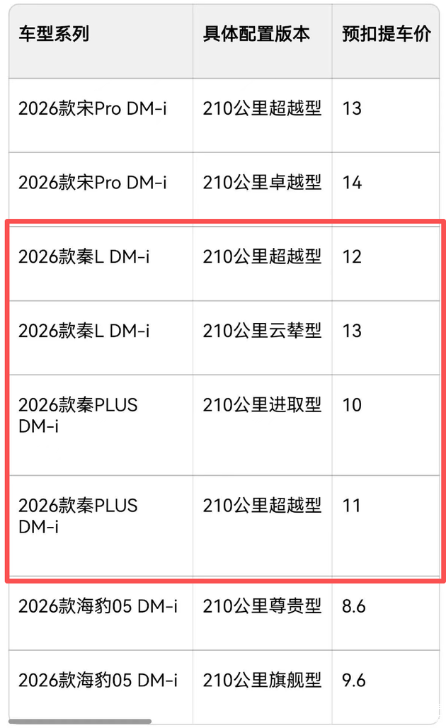 预计两款新车将在1月8日正式推向市场。从经销商的预扣提车价来看,26款秦PLUS DM-i长续航版可能会推出210公里进取型和210公里超越型两种配置,它们的价格分别定为10万和11万;有26款秦L DM-i长续航版,以及210公里超越型和210公里云辇型两种配置,它们的售价分别是12万和13万。通常情况下预扣提车的价格都要比实际上市的价格要高,那你觉得26辆秦家族长续航版的价格有多适合你?欢迎大家留言讨论。