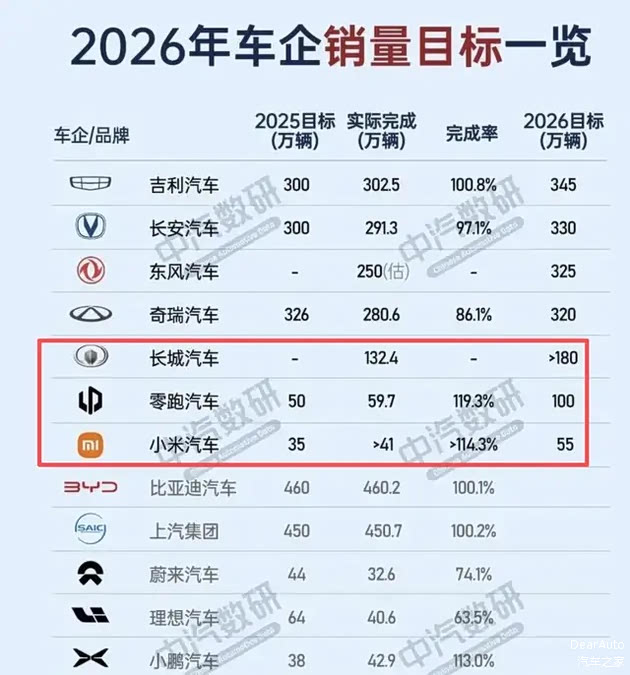 我们再来横向对比一下,零跑2025年60万的体量更大,但今年直指100万辆,预计增速要达到67%;规模是小米3倍的长城汽车今年目标为180万辆,预计增速36.4%。