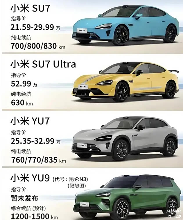 小米现在的车型只有2款——SU7和YU7,Ultra是衍生版本。今年将新增三款包括全新大型增程SUV小米YU9、中大型高性能纯电SUV YU7 GT以及大型旗舰轿车SU7 L,将覆盖更多的细分市场。