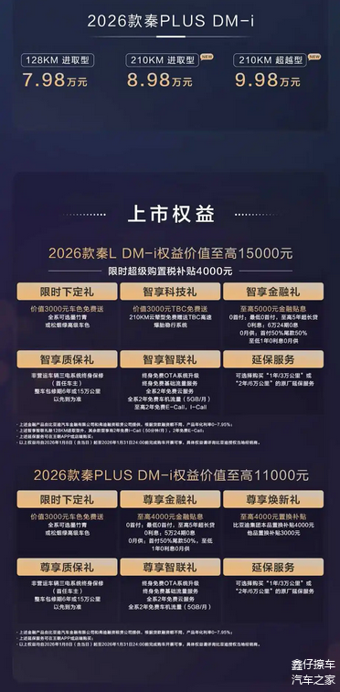 1月8日,我们从比亚迪官方了解到,2026款比亚迪 秦PLUS DM-i正式上市,共推出3款配置,售价区间为7.98-9.98万元。同时,此次改款增加长续航版本,主要升级电池容量和纯电续航,电池容量25.28kWh,CLTC纯电续航为210km。从定价结构来看,秦PLUS DM-i依旧处在紧凑型新能源轿车的入门到主流区间,价格门槛并未抬升,延续了该车系一贯的成本控制逻辑。