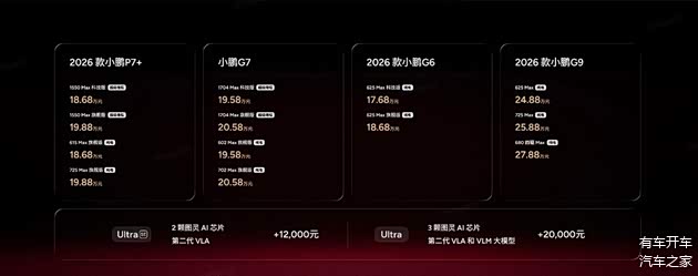 【有车开车资讯】2026年1月8日,在2026小鹏全球新品发布会上,小鹏汽车正式发布2026 款小鹏 P7+、小鹏 G7 超级增程、2026 款小鹏 G6、2026 款小鹏 G9。其中2026款小鹏P7+ 全球36国同步发布,新车有超级增程和纯电两种能源形式,超级增程有1550 Max 科技版和1550 Max 旗舰版,官方指导售价为18.68万元和19.88万元;纯电有615 Max旗舰版和725 Max 旗舰版,官方指导售价为18.68万元和19.88万元。2026款小鹏G7推出四个版本,超级增程1704 Max 科技版和1704 Max 旗舰版,官方指导售价为19.58万元和20.58万元;纯电602 Max 旗舰版和702 Max 旗舰版,官方指导售价为19.58万元和20.58万元。2026 款小鹏 G6推出纯电625 Max 科技版和625 Max 旗舰版,官方指导售价为17.68万元和18.68万元。2026 款小鹏 G9推出纯电625Max、725 Max和680 四驱Max版,官方指导售价为24.88万元、25.88万元和27.88万元。