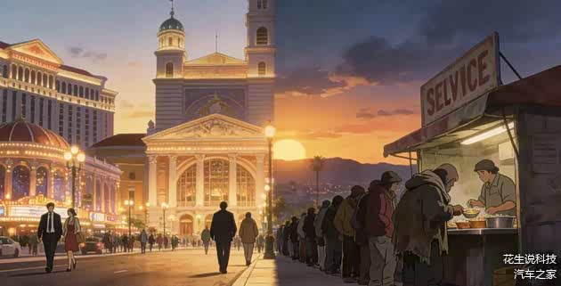 ——我住的地方紧邻市政厅,这条建筑中轴线仿佛一道无形的界限:一侧是音乐厅、歌剧院和豪华餐厅,每晚都有人衣着光鲜,追求精神消费的愉悦;另一侧的大型广场,每到傍晚就挤满了领取救济餐的穷人,他们裹着破旧的衣物,在寒风中排队等待果腹的食物。