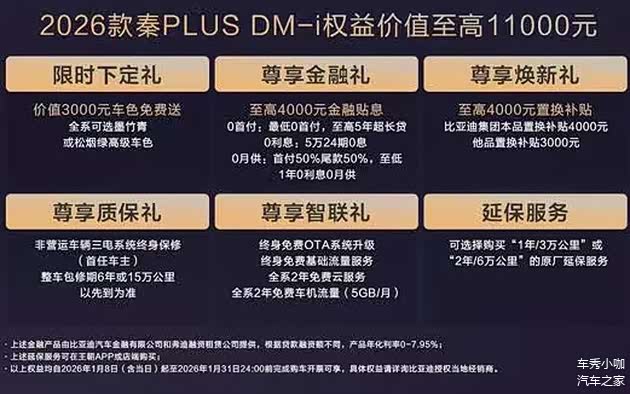 2026年1月8日,2026款比亚迪秦PLUS DM-i正式上市,共推出3款配置,售价区间为7.98-9.98万元。同时,此次改款增加长续航版本,主要升级电池容量和纯电续航,电池容量25.28kWh,CLTC纯电续航为210km。