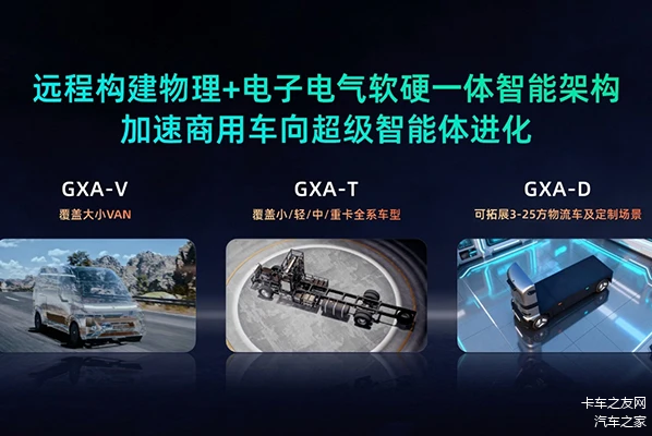 硬件是AI的载体,也决定着AI能力进化的上限。远程在线控底盘技术基础之上,实现物理+电子电气软硬一体智能架构,打造出新一代全域智能架构。面向VAN车、卡车、无人车,实现GXA-V、GXA-T、GXA-D三大物理架构全面落地。未来将逐步构建以中央计算架构为核心架构,引领行业进入中央计算阶段。