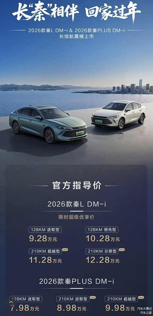 更震撼的是价格诚意:2026 款秦 L DM-i 限时售价11.28万元- 12.28万元, 秦PLUS DM-i售价低至8.98万元- 9.98万元,让高端技术直接走进全民消费区间。