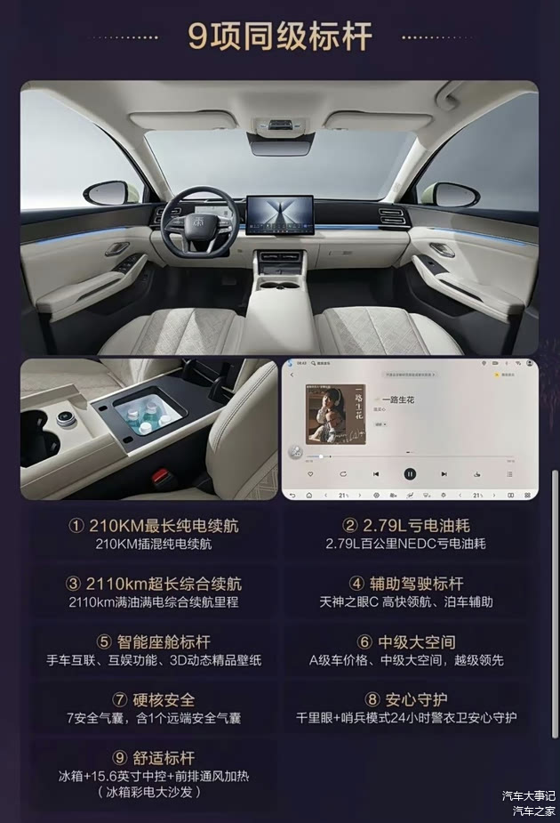 对于日常通勤50公里以内的家庭,210KM纯电续航能实现 “一周不补电” 的纯电自由;对于长途出行、过年返乡的用户,2110公里综合续航 + 超低亏电油耗,不仅能一箱油直达目的地,更比燃油车一年省下万把块,真正做到 “通勤用纯电省钱,长途用油无焦虑”。