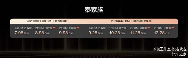 2026 款比亚迪秦家族 210KM 长续航版正式上市,以 “加量不加价” 的诚意,重塑 10 万级新能源家轿价值标杆。新车涵盖秦 L DM-i 与秦 PLUS DM-i 系列,价格区间贴合主流消费预算,首任车主还可享三电系统终身质保政策,用车无忧。