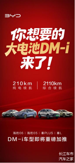 2026年1月7日,比亚迪宣布为秦PLUS DM-i、秦L DM-i、海豹05 DM-i及海豹06 DM-i这4款热销车型加推长续航版,其CLTC纯电续航均突破210km,相比同级混动车型的纯电续航翻一倍,真正实现“一周一充”的纯电通勤体验。超2110km的综合续航,再配上只需20分钟就能从30%充到80%的充电速度,比亚迪大电池插混车型全面覆盖日常通勤与长途出行全场景,消除里程焦虑,续航无忧让车主安心放心。
