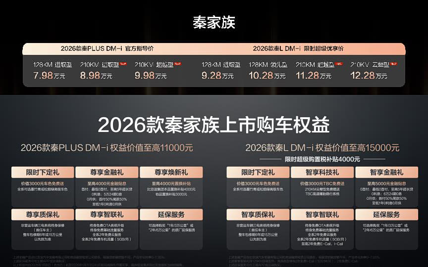 开局即来点狠的,比亚迪2026款秦PLUS DM-i 210KM长续航版两个版型,售价分别为8.98万和9.98万元,两款车型在智能辅助驾驶功能方面有所区分,不到十万元即能拿到长续航L2级智驾辅助,具备高速NOA功能的顶配版,确实更香。