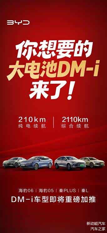 2026年1月7日,比亚迪宣布为秦PLUS DM-i、秦L DM-i、海豹05 DM-i及海豹06 DM-i这4款热销车型加推长续航版,其CLTC纯电续航均突破210km,相比同级混动车型的纯电续航翻一倍,真正实现“一周一充”的纯电通勤体验。超2110km的综合续航,再配上只需20分钟就能从30%充到80%的充电速度,比亚迪大电池插混车型全面覆盖日常通勤与长途出行全场景,消除里程焦虑,续航无忧让车主安心放心。