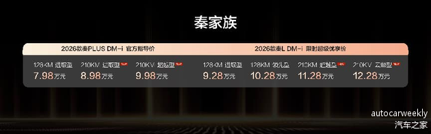 2026款秦L DM-i与2026款秦PLUS DM-i 210KM长续航版,凭借超长续航打破出行边界,以豪华科技配置重塑家轿体验,精准满足不同家庭需求。作为插混轿车的引领者,秦家族以硬核产品力和越级价值,必将成为2026年行业风向标,引领家轿市场迈向高品质发展新阶段。