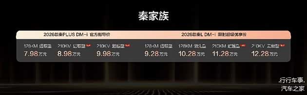 2026款秦L DM-i与2026款秦PLUS DM-i 210KM长续航版,凭借超长续航打破出行边界,以豪华科技配置重塑家轿体验,精准满足不同家庭需求。作为插混轿车的引领者,秦家族以硬核产品力和越级价值,必将成为2026年行业风向标,引领家轿市场迈向高品质发展新阶段。