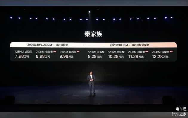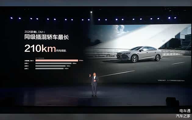 此次发布会的重点简洁明了:提升纯电续航,降低用车成本。2026款秦PLUS DM-i和秦L DM-i均新增了长续航版本,电池容量提升至25.28kWh,CLTC纯电续航里程一举突破至210km。