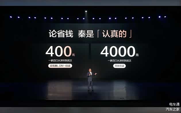 除此之外,两款混动车型的亏电油耗低至2.79L/100km(NEDC),综合续航达到2110km。发布会现场,比亚迪王朝网销售事业部总经理路天直接算了一笔账:一家四口驾驶秦L DM-i往返深圳和武汉,全程只要400元,而高铁往返则需要4000元。