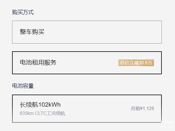 再然后,如果车主选择的是租电版本,现在100度电池包,一个月租金是1125元,付4送一,一般情况下, 车主租电都是一年租算起,一般也就是902元一个月,但考虑到有些车主,会把电池包换成75度的,租金是728元,实际电池包是583元每个月,租电一年成本是10824元,75度是6996元,选择租电,保险费会直接降低1000元。