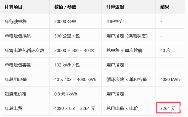其次,用车成本,一年2万公里,按照蔚来ES8纯电续航638公里,就取更加实际一点的续航,500公里来计算,而一个电池包是102kwh,而不同时间段电费也不一样,就按照0.8元来计算,总续航除于实际续航,再然后×电池包容量,再乘以电费,我们就可以得出来3264元,考虑到一些车主喜欢充12点后的电,那你就再这个基础上打个8折就行了。