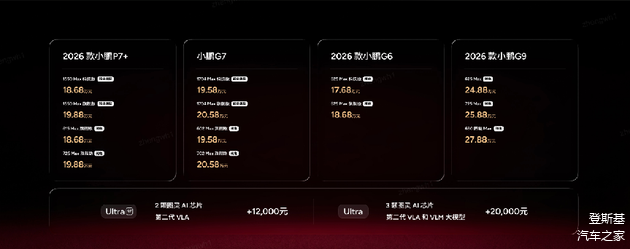 在2026小鹏全球新品发布会上,小鹏汽车正式发布2026 款小鹏 P7+、小鹏 G7 超级增程、2026 款小鹏 G6、2026 款小鹏 G9。其中2026款小鹏P7+ 全球36国同步发布,新车有超级增程和纯电两种能源形式,超级增程有1550 Max 科技版和1550 Max 旗舰版,官方指导售价为18.68万元和19.88万元;纯电有615 Max旗舰版和725 Max 旗舰版,官方指导售价为18.68万元和19.88万元。2026款小鹏G7推出四个版本,超级增程1704 Max 科技版和1704 Max 旗舰版,官方指导售价为19.58万元和20.58万元;纯电602 Max 旗舰版和702 Max 旗舰版,官方指导售价为19.58万元和20.58万元。2026 款小鹏 G6推出纯电625 Max 科技版和625 Max 旗舰版,官方指导售价为17.68万元和18.68万元。2026 款小鹏 G9推出纯电625Max、725 Max和680 四驱Max版,官方指导售价为24.88万元、25.88万元和27.88万元。